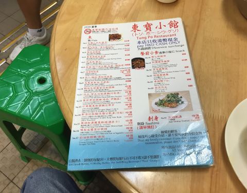虽说是大排档,东宝小馆却是位在一栋楼里。这栋渣华市场,一二楼是菜市场,三楼则是有点类似搬到室内后的士林夜市的熟食街市。占了这个熟食街市大半区域的东宝小馆,只有晚上才营业,非常热门,若要来此用餐,记得要订位。 类似室外路边摊的混乱桌椅,墙壁贴著不同世代的电影海报,以及用奇妙字体写的菜单。这是一个很有趣的空间。