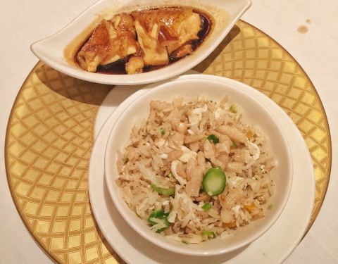 来到金叶庭,果然是有点金碧辉煌的感觉,古典华丽的装饰,很有艺术气息。这家店以粤菜见长,已经连续几年被米其林评为一星餐厅,服务生都是些上了些年纪的男士,一举一动很是沉稳低调,每次上菜除了报菜名还会简单介绍几句食物的特点和吃法。 “金牌吊炸鸡”堪称香港第一无人能及。外观很像我熟悉的北京烤鸭,外皮焦红薄脆,用入口即化这大俗成语来形容太贴切不过,不但皮好吃,鸡肉也异常柔嫩,保持着天然的肉香。制作起来自然有绝技,一系列油淋加小火慢蒸的工艺才让这只鸡从里到外都那么可人,要向爱鸡的厨师说声谢谢。山楂川汁爆虾球,新鲜虾球脆炸后淋上开胃的山楂汁,酸中可能还有些轻微的辣味,不知加了什么佐料,虾球香脆弹牙,我当时有点吃到了北京冰糖葫芦酸酸甜甜的神韵,为了后面各种美食开胃爽口。金叶庭炒饭,貌似简单,实则是金叶庭的招牌之一,差点被我错过。说是炒饭,配料却几乎与米饭等量,松子,石斑肉,瑶柱,蛋白,菜粒等食材在口中组成不同口感,又香又脆又软又爽,名不虚传