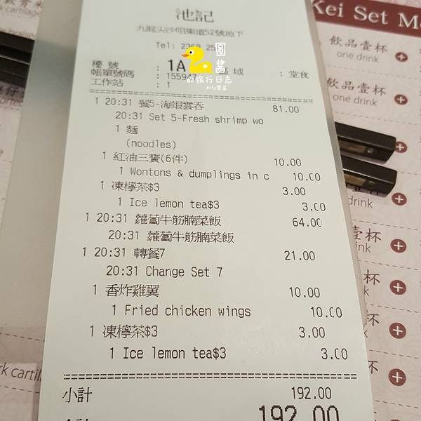我们去的是池记尖沙咀店,就在市中心,很靠近美丽华和the one还有海港城,大概步行15分钟就到了,我们在大陆用常规的地图就能导航到的;怎么说,池记味道其实一般,但是胜在服务好!人均80RMB的样子吧。味道3分,但是服务5份,综合4分吧尖沙咀的池记还挺多人排队的,在外面排队等叫吧,如果是一个人去吃的话,可能比较容易排到;在外面就会有立着的菜单,可以一边排队一边看吃啥室内其实挺小的,然后旅行箱什么的可以放在餐厅的走道上面,其实挺好的,不像其他餐厅不允许放在里面; 然后我们两个人点了两个套餐,人均80RMB,点套餐就足够了,可以吃的很饱; 服务员有些可以听得出是大陆口音,但是用餐氛围都挺好的,蛮热情的,大家基本都是微笑点餐微笑用餐嘻嘻。说实话味道一般吧,云吞面不够入味,牛腩还不错,但是很多网红店云吞面都一般般,通病吧 推荐可以尝试蟹黄粥、云吞面、萝卜牛腩饭、柠檬茶【注意】 店里只收现金,如果不够港币可以用人民币,说实话这是我见过汇率比较好的一家店了吧1:1.25,0.80的汇率,现在汇率大概都0.82的样子,用人民币付也不会吃亏哟用餐结束后,还送了我们两张6港币的代金券来着。总之还挺轻松的用餐环境。