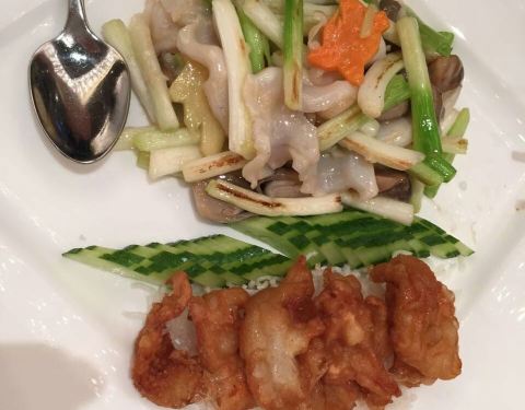 吃的东西还是很正宗的味道吧,椒盐虾很酥脆,然后猪颈肉烤的火候也刚刚好,炒的鱿鱼稍微淡了一点,不...