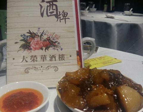 大荣华酒楼,常规的酒楼,有着企业式的精神,大荣华酒楼的宗旨,选用新鲜材料,顾客至上服务,希望里面的餐点也可以满足我的胃,B仔凉粉。居然私影完能吃一套正式的晚餐出来天还是亮的!大荣华很好吃,而且量也超足,最感动的必须是几辈子没吃过的猪油捞饭,特色是有腊味的香气。B仔凉粉真的好甜,下回要吃今天没吃到的鸡翼尖~ 我之后2个月就指着这顿饭回味撑下去了!啊,我爱元朗!