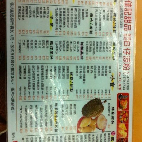 B仔凉粉是绝对的镇店之宝,这盆神级糖水,每天吸引无数人来朝圣,店里百分之八十都是香港本地人,店里有很多种品种,琳琅满目,第一次感觉到眼睛大肚子小~来自于网络开始只是一个叫B仔的人跟老板提议做一个水果山凉粉,结果做出来之后十分的受欢迎,究其名字叫B仔凉粉了。来自去哪儿用户@从雪来自去哪儿用户@空气贝儿这家甜品店如今还有另外一个特色——蒜茸香辣鸡翼尖,这种甜咸搭配也能让人食欲大增。来自去哪儿用户@凉薄时光葬空城佳记甜品每天营业从12:00(中午)-2:30(凌晨),在宵夜时分最多人。它的店铺不断的抗张,但每天依然爆满了。