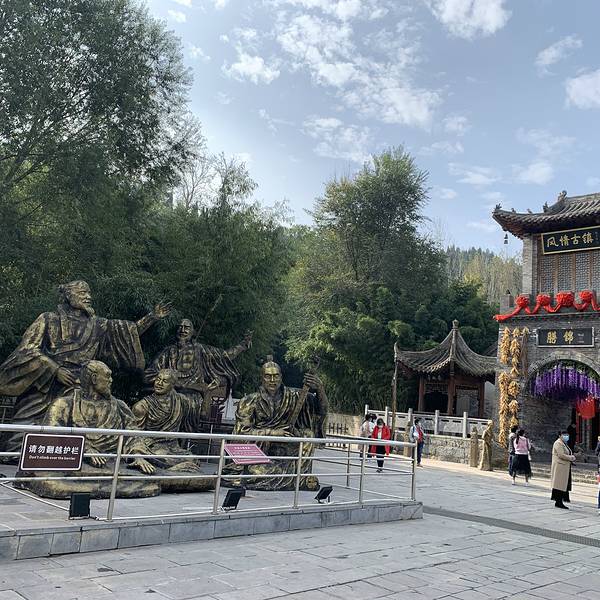 景区的必经之路风情古镇,因为来得早,古镇多数小吃还未营业,我们打算下山时再逛,所以速度的穿过小镇,买了到景区大门的往返票,一人二十元,山里大得很,保存体力。第十三届了古镇进口,左侧是竹林七贤丰收的...