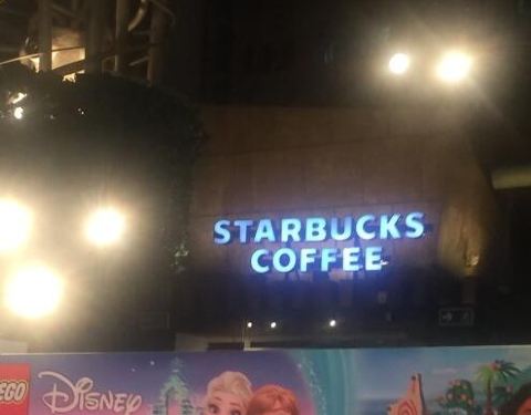 朗豪坊的星巴克就在四楼的中庭位置,可以说位置和视野都是相当开阔的。正好“美女与野兽”在中庭做宣传活动,因为楼上就有个电影院。刚好在星巴克这里座下,喝着咖啡看着活动宣传,时间到了就上去看场电影