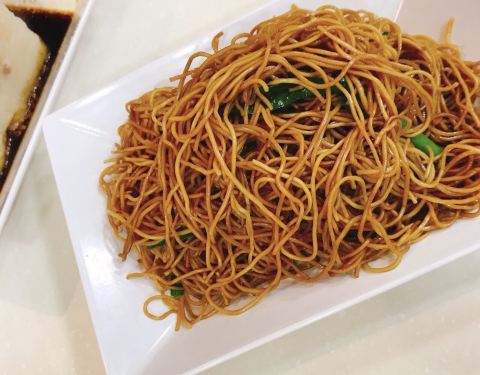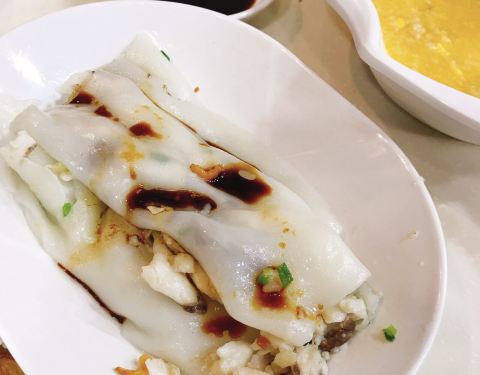 - 这家店的叉烧肠粉也不错,嫩滑的肠粉包裹着大块叉烧,浇足酱油,特别入味