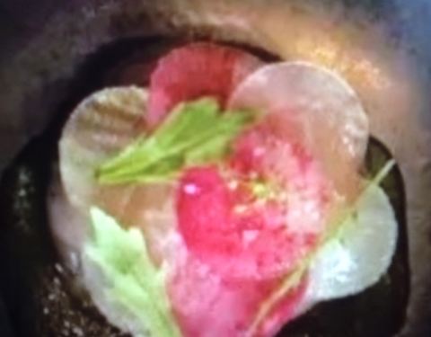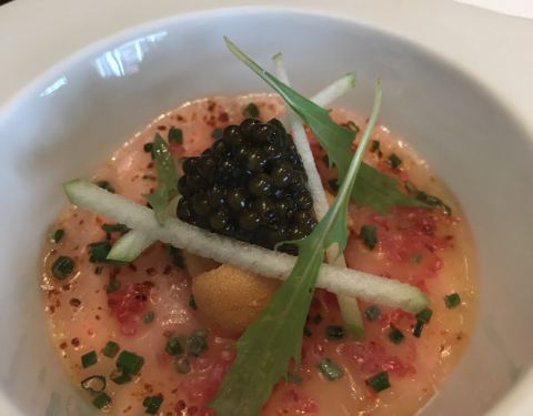 Sepia-saikou salmon belly, smoked roe, sudachi,chrysanthemum buri yellowtail belly, dashi cream, water chestnut, nori, caviar