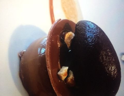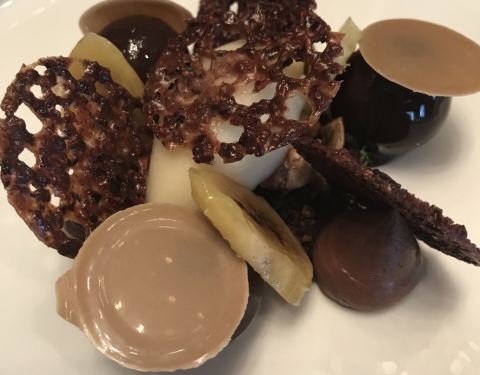 caramelised milk chocolate caramelatte play of textures with cacao sorbet, praline dust, caramelised almonds, salted caramel and kalamanski