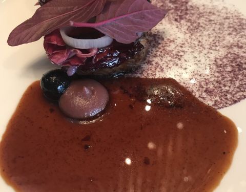 pigeon au sang breast pan roasted on its carcass, tartare of fuyu kaki and sansho blossom pigeon jus with persimmon vinegar
