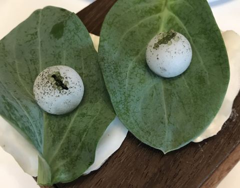 ebisu winter oyester over a plankton gel with organic kale seawater and organic lemon jelly-o and mustard cress bloom