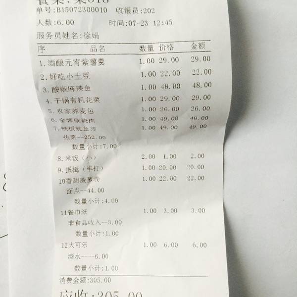 【价格】我们总共六个人,吃了七个热菜、两个甜点、两碗米饭、一瓶可乐,总共305元,没要发票,实付300元,人均50元,菜品基本算家常菜。