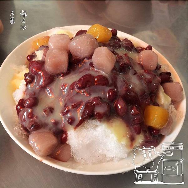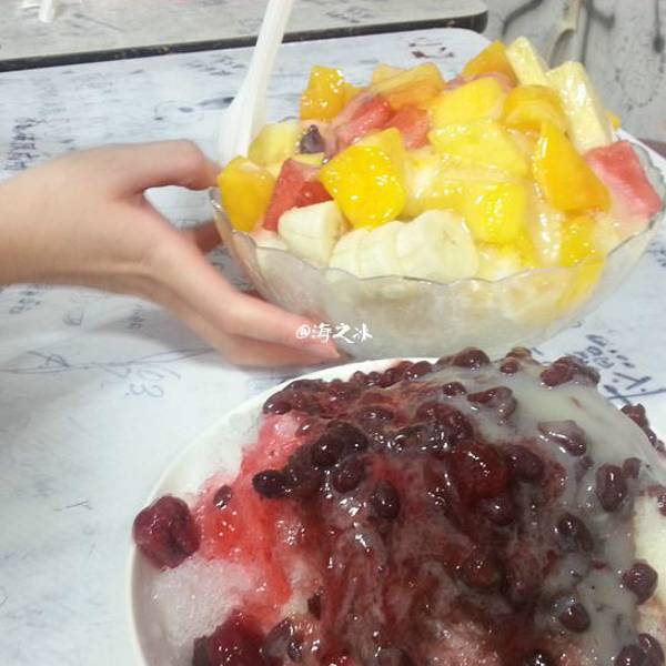 全台十大人气冰店之一,海之冰有超过100种冰品、豆花、甜汤、果汁,招牌大碗冰盛满丰富的当季水果,淋上酸甜的酱汁人多的话,还可以做成超大份,有2倍冰,3倍,5倍6倍直到20倍冰,最大的像洗面盆一样大,非常夸张。我们两个人点了一份小的,已经是吃不完啦。不过真的是又香又棉,透心凉。