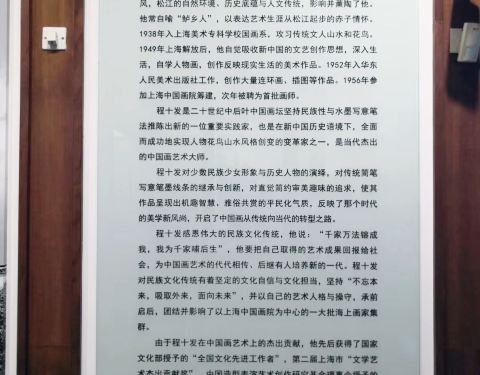早就想来打卡程十发美术馆,因为电视里介绍过,所以怕人太多一直没来。目前疫情期间需要提早预约。周末居然没啥人。一楼是程十发作品展区。一楼半阅览室。二楼中国画院其他作品。三楼林风眠作品展。走道里的一些画都有故事,比较有趣。喜欢字画的可以看看。