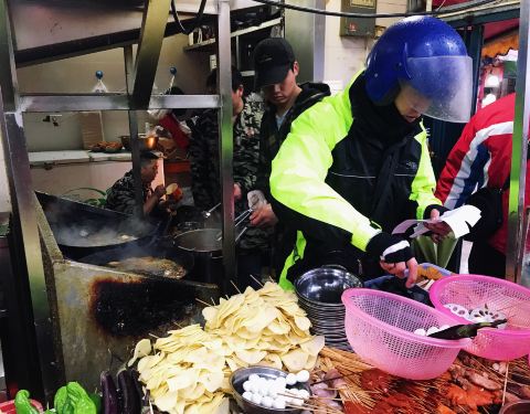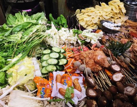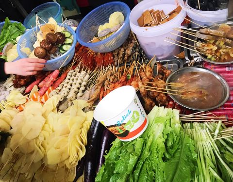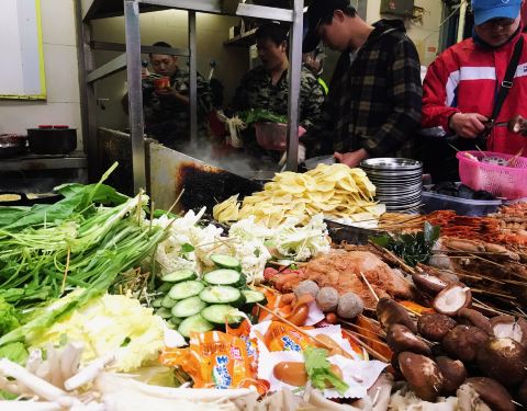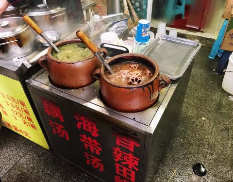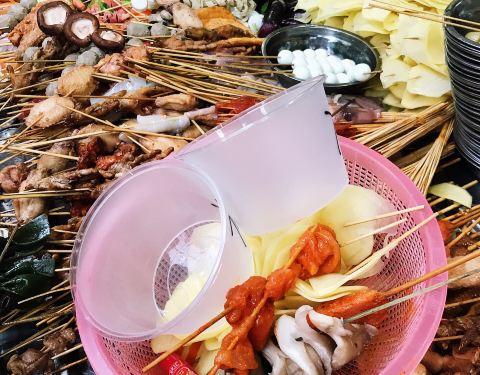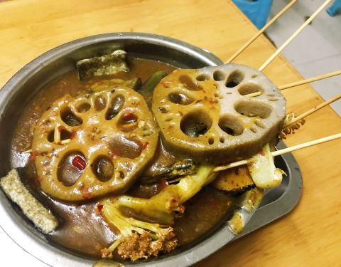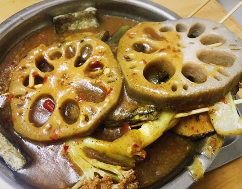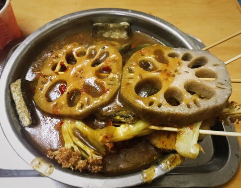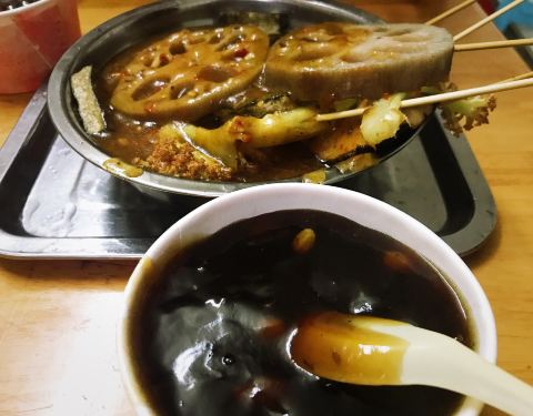 土豆片,学校门口、小区集中地必有的小吃,以前以为到处都有,长大后才只有出了黄石你真的找不出来了。 黄石最老牌的标杆性土豆片也就是体委的大众小吃了,几十年不变的地方和口味,价格一直涨,但吃的人却多得不得了,什么时候去基本都排队,现在多了外卖,一般外卖小哥自己上手配菜,店员根本就忙不过来。 必点:土豆片、藕片、臭干子,炸老点更好吃。灵魂是酱料,辣中带点燥,重口却又停不下来。 再来碗藕粉,藕粉极浓稠,颜色深红,葡萄干微酸,解辣又滋润。 吃一遭才不辜负回家一趟