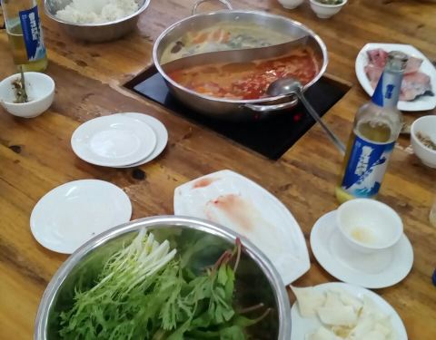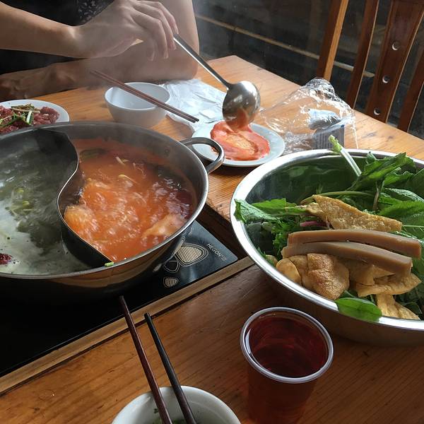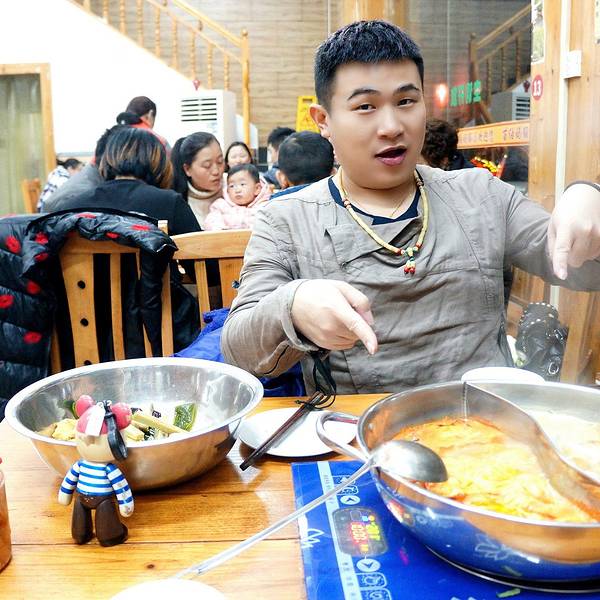 下了山饿了就冲着这家店去吃,比较出名。 坐公车的时候要多留意路,会经过农行,会过一座桥。就在那座桥反过来看,左边有个亭子,往右走,一直走留意右边,看到X家乐超市,就往那路走,再右拐走就看到了。 我们要了鸳鸯锅,蘸酱加了酸汤不错。这酸汤也是相当不错的,相当开胃,又酸又辣,越煮越酸哈哈我是很喜欢的,喝了两三碗。那里青菜是算5块钱一个人,肉的话大盘20小盘10.吃来吃去94块钱的食物我们就饱了,最后还直接讲价讲到90,这样人均30超实惠的!推荐各位。