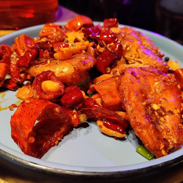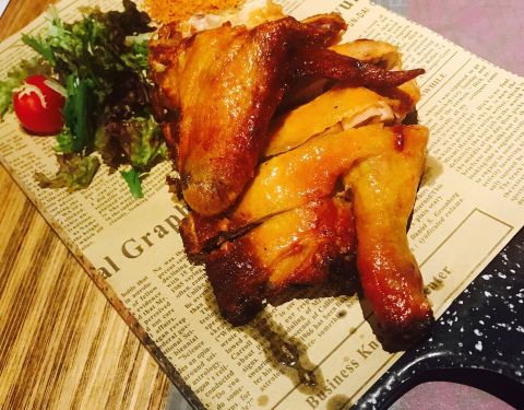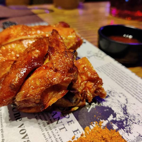 西餐酒吧环境很好,布置好多红酒和海报,画画等装饰品,灯光效果有舞台的感觉。 烤原只春鸡是脆皮鸡,有种想用手撕开就吃,大口大口地才过瘾。沾泰式甜辣酱更加开胃。 美国精选牛板腱,牛肉够嫩,火候掌握得很好...