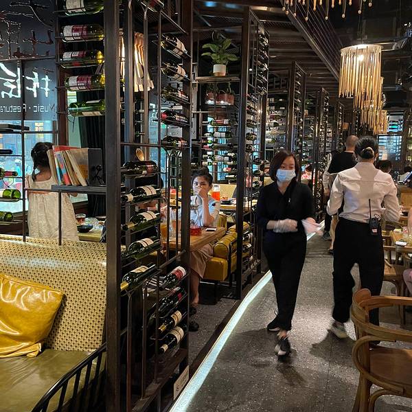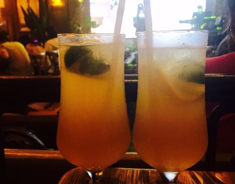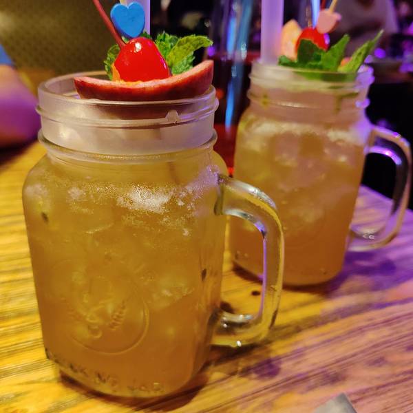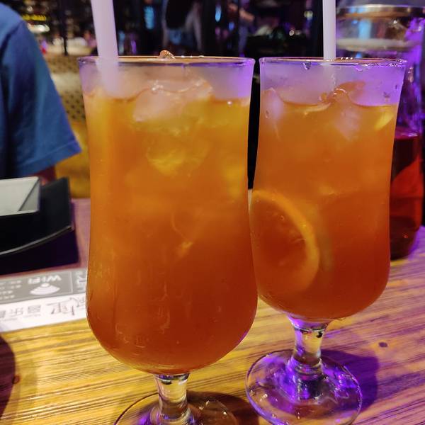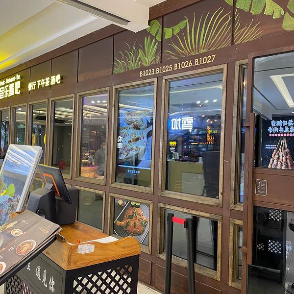 挺大一间,有室内室外,室外像一个花园一样,室内就是酒吧风,晚上有驻唱,比较吵,基本很难聊天,卡座的位置宽敞舒服,普通桌子就比较小服务员态度还可以,就是老是有人带着工卡走来走去,看这看那,好像巡查一样,不太喜欢出品味道一般般,卖相还可以,价格适中【精选牛板腱】五成熟,看起来有八成了,外焦内嫩,但是没什么肉味【泰香烤原只春鸡】半只,有点偏干了,皮挺脆,肉滑嫩,泰式酸辣酱很好吃【香辣大虾】好脆,皮都可以吃,有点偏辣了,而且虾不多【法式培根沙拉】普通吧,酱不是很好吃【火腿蛋炒饭】有嚼劲,味道还不错,就是青椒太多了【印尼虾片】香脆,挺大片【柠檬茶】茶味挺浓,味道可以,喝到下面有点淡【最美时光】百香果+苹果汁+香草糖浆,挺好看的,味道普通吧,有点像果汁出品一般,服务环境还可以,价格适中