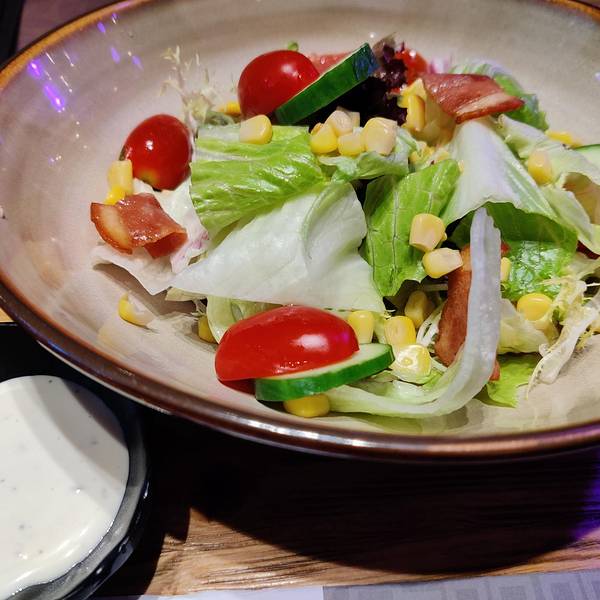 【法式培根沙拉】普通吧,酱不是很好吃。【火腿蛋炒饭】有嚼劲,味道还不错,就是青椒太多了