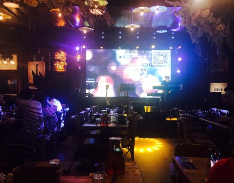挺大一间,有室内室外,室外像一个花园一样,室内就是酒吧风,晚上有驻唱,比较吵,基本很难聊天,卡座的位置宽敞舒服,普通桌子就比较小服务员态度还可以,就是老是有人带着工卡走来走去,看这看那,好像巡查一...