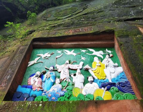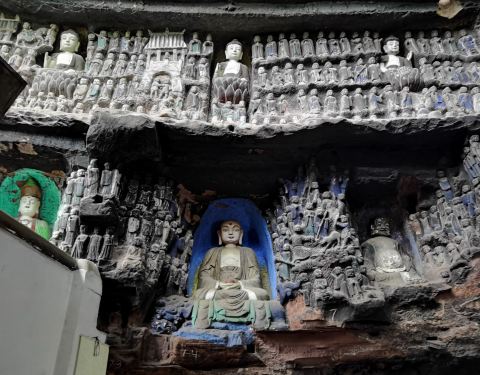 始建于距今千年晚唐时期的药师岩石窟位于飞凤山上,有15窟35龛、大小摩崖造像一千余尊,在石刻艺术方面呈现出民间化的气息,非常的接地气…从斜源古镇过来半个小时,路况总体还行,车挺在山脚的农民家,10元,然后沿着石梯一路上行,一路都是竹林,很凉爽,大概半个小时到顶,就可以一览石刻风采,山顶的风景也不错。