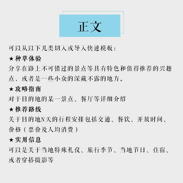 🤔什么是金骆驼笔记🔖 “什么样才算一篇金骆驼的笔记呢❓” “为什么我发的笔记不如别人的有感觉❓” “怎样才能让我的笔记收获更多驼粉❓” 今天,小驼完全满足大家的好奇整理了一篇金骆驼笔记快速发布攻略📜,希望能帮助各位聪明旅行家更好的分享旅行路上的创作灵感🤩 1️⃣Part1图片🌉 精美的图片能让旅行家们快速注意到你,是笔记中不可或缺的重要元素哟 ✅1.不少于5张图片 ✅2.画质清晰,色调风格尽量统一,并与内容相呼应✅3.第一张是封面图哟,推荐选择能够体现内容主题和亮点的美图 🚫4.图片上不能出现水印、二维码等广告信息哦 2️⃣Part2标题📌 为笔记准备一个能够点明主题,突显亮点的标题,可以帮助即将出行的旅行家们快速获取你分享的核心信息 基础标题:目的地/地点名称+能解决的需求点 ⭐️当1日熊猫饲养员?码住这些成都新奇体验 ⭐️北京探店!那些高能玩家才知道的深巷买手店 ⭐️曼谷小众餐厅推荐 | 让你和当地人排排坐 3️⃣Part3正文🔖 正文就请大家尽情分享吧~!如果想说的太多,不妨试试一键导入对应模板 正文要注意避免以下几种情况: 🚫1.百科式的讲解和流水账式的游记 🚫2.纯抒情,无实用信息的文字 🚫3.段落分隔不清晰,大篇幅文字堆积 🚫4.推荐竞品的购买信息 4️⃣Part4加分项💖 除了以上几个必备要素之外,还有哪些加分项可以让你的笔记脱颖而出呢? 📍【位置】添加文中重点提及的具体景点/酒店/餐厅/商店等. 📣【话题】积极参加官方话题讨论,会更容易被推荐哦. 🤠【达人】单个目的地发布的金骆驼内容越多,越容易被官方认证为目的地达人哟! 最后~你的金骆驼笔记会被很多驼粉看到哟,别忘了与喜欢你的朋友们热情互动哟!🥳快试试这些方法,发布你的金骆驼笔记吧!🛫