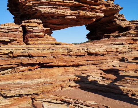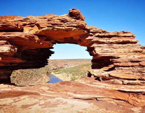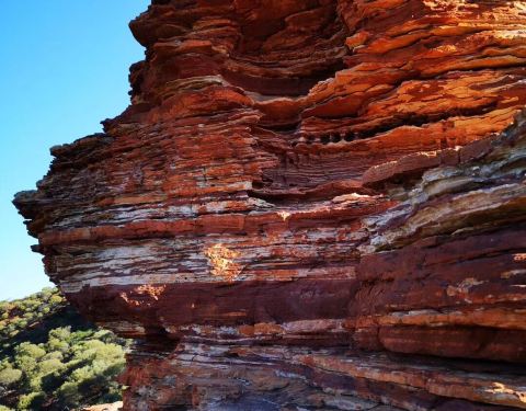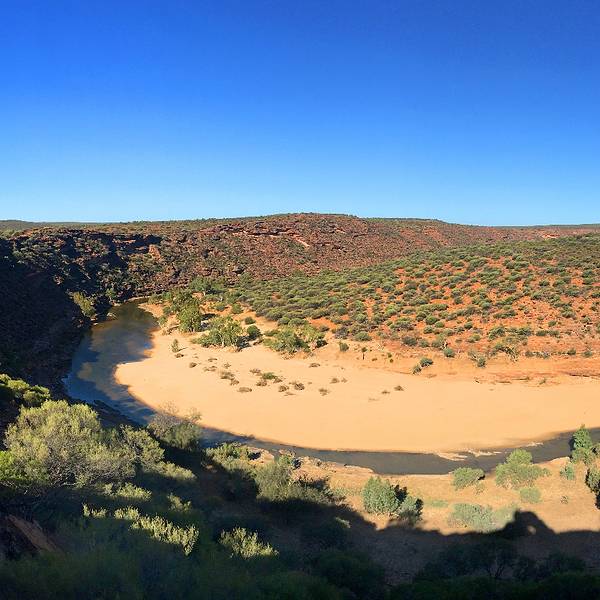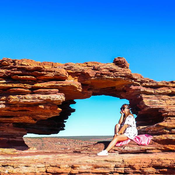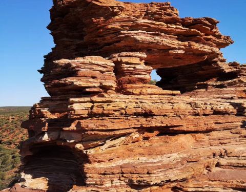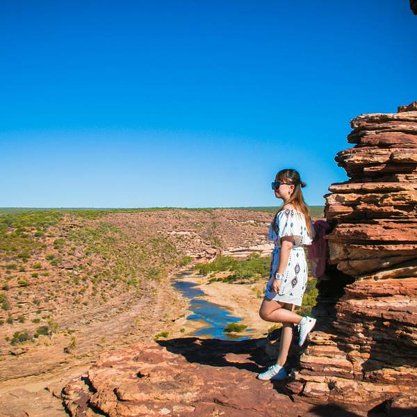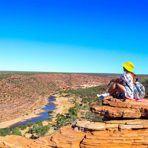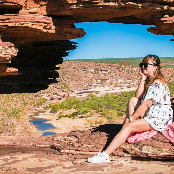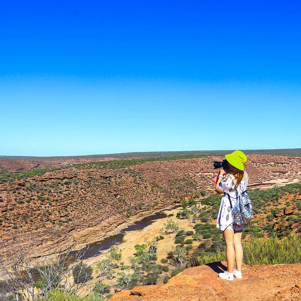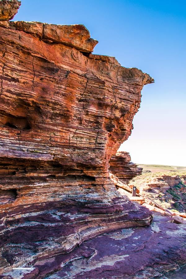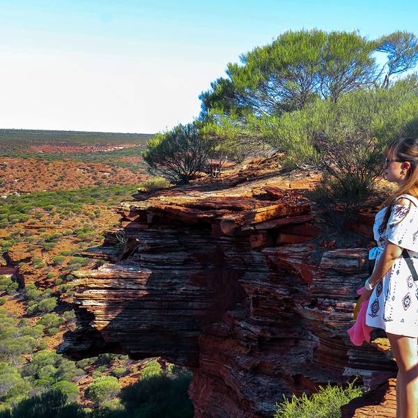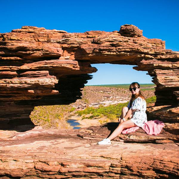 放好东西,等太阳没那么晒了,我们4点半出发,去 卡尔巴里 国家公园 ,看4.2亿年前 自然给大家开的一个窗户 自然之窗这地儿的苍蝇,就开始发威了 从停车场走到自然之窗顶多500米,但是小果蝇真的很多,是非常小的那种苍蝇,很容易进鼻孔,进嘴巴,好恶心 我一直盖着大围巾走着这里的感受就像看 美国 西部大片一样 古老海床形成的红色砂岩和壮观的墨奇森河(Murchison River)又是一个分分钟让你体验跳崖的好地方 各种心惊胆战的悬崖坐坐坐走去自然之窗的后半段,是在各种岩石上爬行万物皆空,耳边鸟叫,果然是个修仙的好地方Nature's Window 世界自然遗产