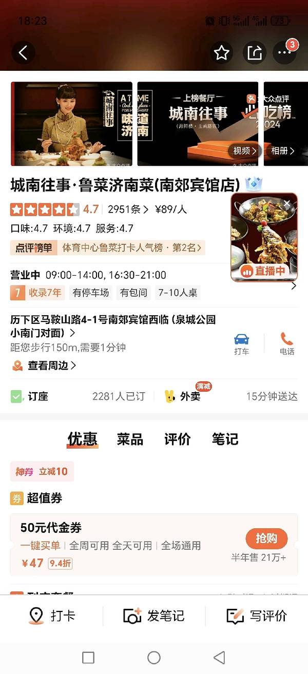 鲁菜系的餐厅,适合家庭聚餐,菜品有许多经典鲁菜,如糖醋鲤鱼,选用黄河金鲤鱼,肉质外酥里嫩,酸甜可口;九转大肠,嚼劲十足,酸甜味覆盖了大肠的腥臊味;老济南精品把子肉,卤味十足,肉质酥烂,肥而不腻。此外,果木挂炉烤鸭也是店内主打,一鸭三吃,鸭皮酥脆,鸭肉细嫩。