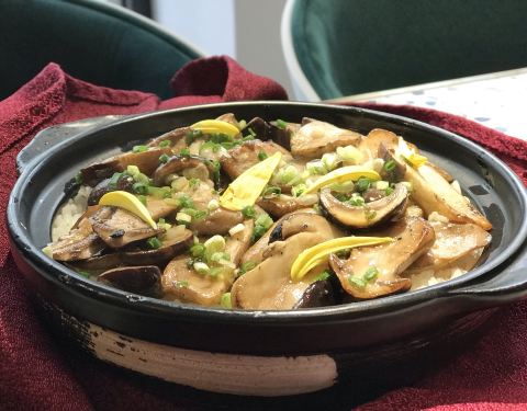 笕箪不简单,位于安远路上的素食餐馆,现今人们都以健康饮食为推崇,素食就是很好的选择,吸引不少年轻白领客人。 郁郁葱葱松茸饭,推荐度很高的一道主食,松茸是营养价值很高的食材,现煲的松茸饭上桌用红绒布包裹颇有仪式感,打开看到铺满的松茸撒上小葱,浇上酱油拌匀就可以吃了,香气扑鼻,松茸很鲜美,就是米饭感觉烂了点。 蛋羹南瓜泥,炖蛋上面铺了南瓜泥,口感也是蛮搭的,小小一盅佐饭或者小食都还不错。
