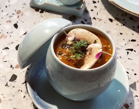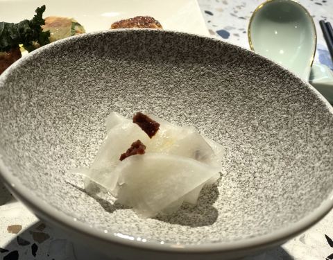 「松露福皮如意卷」名字很好听,脆脆的豆腐皮包裹着菌菇,蘸取酱汁,层次丰富~ 送的餐前小食是梅子腌萝卜,酸酸甜甜无比爽口! 离开前店员还为我们提供了口罩,但想着已经给别人添麻烦了,就拒绝了这番好意,期待下次再见咯!