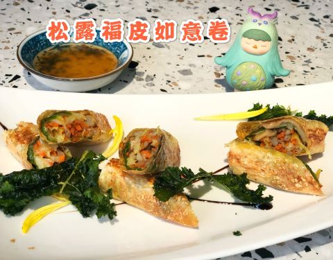 「松露福皮如意卷」名字很好听,脆脆的豆腐皮包裹着菌菇,蘸取酱汁,层次丰富~ 送的餐前小食是梅子腌萝卜,酸酸甜甜无比爽口! 离开前店员还为我们提供了口罩,但想着已经给别人添麻烦了,就拒绝了这番好意,...