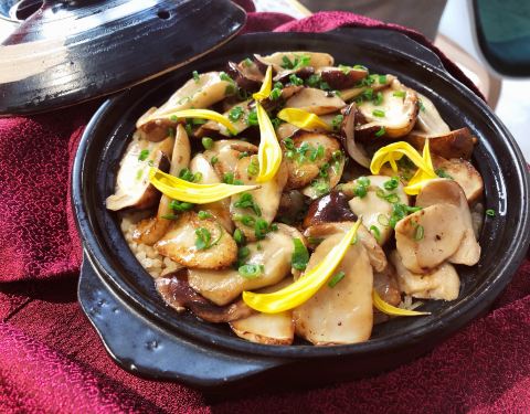 郁郁葱葱松茸饭 砂锅用布包裹着,打开砂锅后倒入酱汁,再次盖上盖子,闷上20秒,就可以享用了