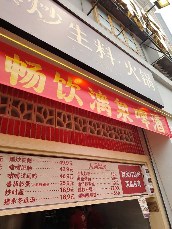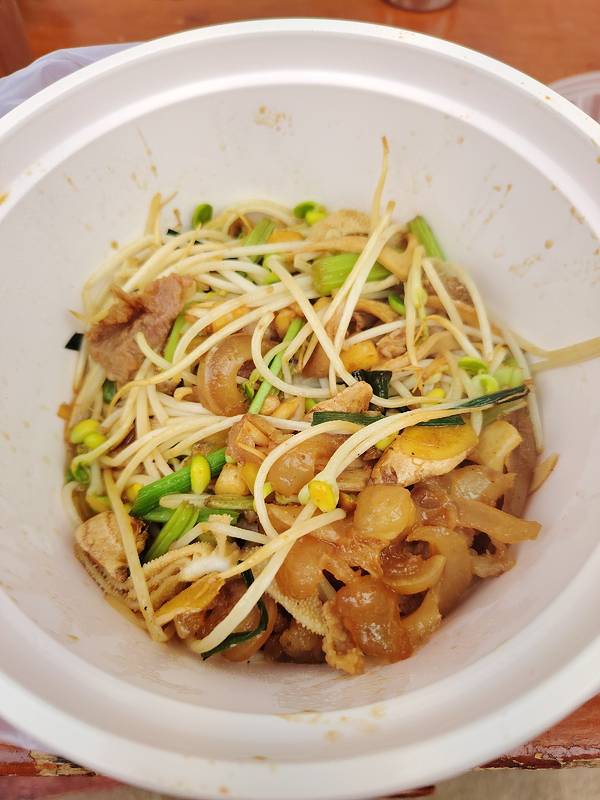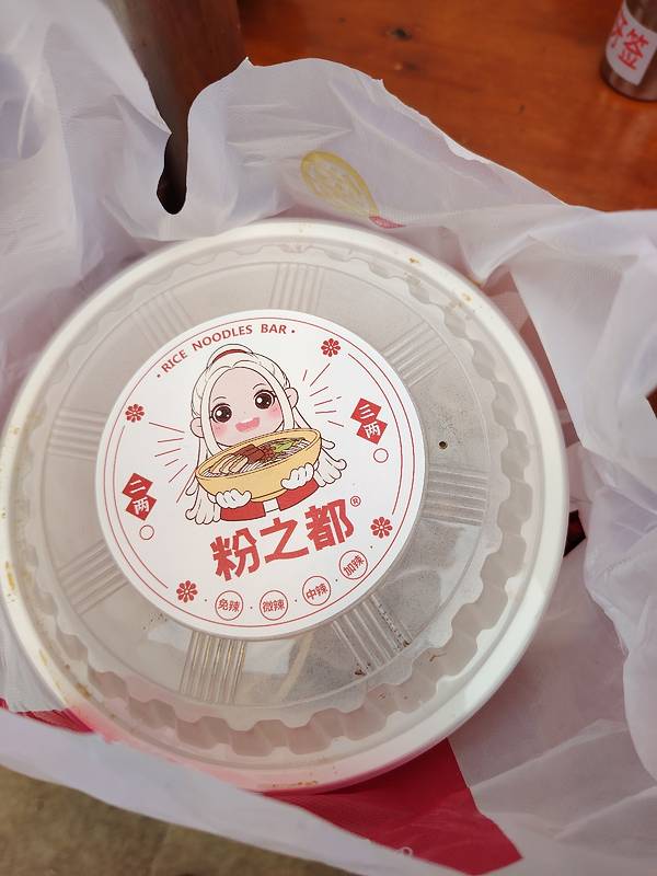 在南宁亭子码头,有家粉之都旗舰店,除了有生料老友粉、桂林米粉、柳州螺蛳粉,还有爆炒生料,这里的生料品种好多,除了通常的牛杂、猪杂,还有田鸡、黄鳝、肥肠等等,我打包了一份牛杂,还配了米饭,爽爽的。