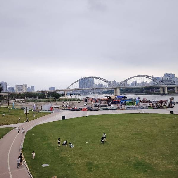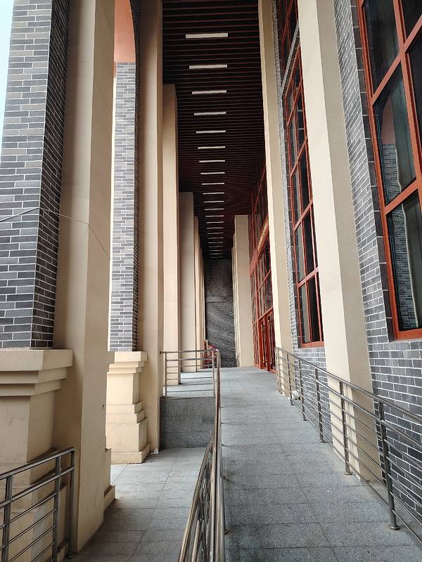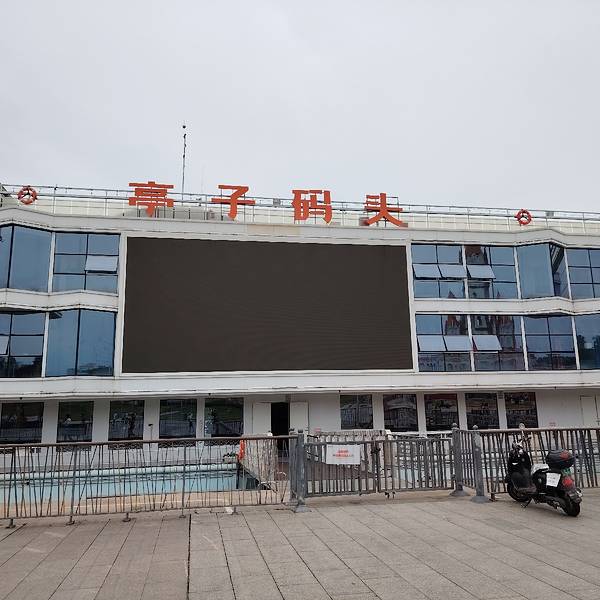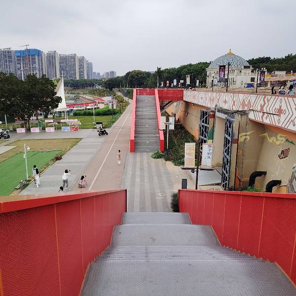 我第一次白天来南宁亭子码头,走到里面是邕江边,从上往下看,江边的广场挺大的,还有草坪,下去的楼梯是红色的,栏杆是壮锦的图案,漂亮。