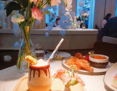 就如店名,店里墙上,空中,桌上都是挂满或者布置成花,很适合女生去打卡,满满的花卉让整个餐厅都充满了浪漫的气息。我们有幸坐到了靠窗户位置(疫情期间避开高峰时间段去的),下雨天更加充满惬意的感觉。美食点的店员推荐的牛排和价格适中的饮料,整体体验感满意度很高,在徐家汇地铁站下车导航很容易找到哒!