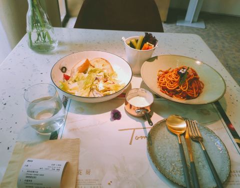🍀餐厅硬核防疫复工之~~Tomacado 花厨 地址:华山路1901号 oneitc商场一层 这个商场也是今年刚建造营业的商场哦~ ⭐这家店离我家很近,步行5分钟就可以到达了,一进门服务员还是很热情的,先是会给你测一下你的体温,然后会给你消毒液洗手,身上也会为你喷一点~ 防疫的工作做的算非常的到位啦! ❤这家花厨 一进门感觉环境真的是非常耳目一新了,好像是进入了一个花的世界~~ 店里到处都放满了小花~每张桌子上都放了一束满天星,整个店里都是绿萌环绕,五颜六色~ 🎀服务员也都是高颜值哦~虽然都戴了口罩,但隔着口罩一个个都非常的帅气和漂亮 💟这家店虽然不大,但是位子之间都摆放的错落有致,一点也不会显得拥挤,特别是淡雅的灯光更加凸显了一丝温馨浪漫感,环境真的是没话说~~特别适合小姐姐过来拍照打卡 |肉酱意面^|鸡肉凯撒色拉^就自己一个人~所以点的也不多,主要是价格也真的不贵,一份沙拉+.一份意面,才刚刚100元出头,性价比真的是非常的高了! 💗真的是一家颜值与味道并存的一家店了 等这次疫情真正的过去,你要不要陪我一起再过来感受一下这人间烟火气~~
