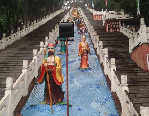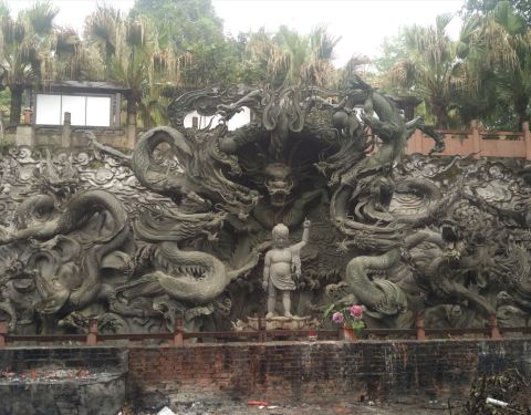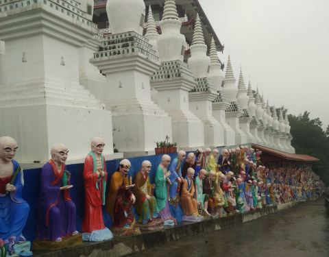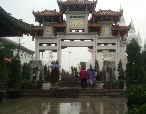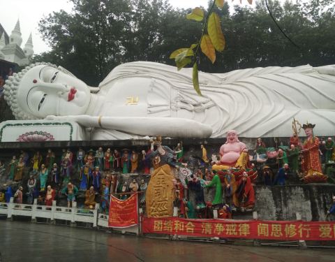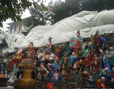 圣水寺 四川省绵阳市圣水寺,建寺于唐广明年间(公元 880 年),明正统元年(1436 年)以“圣水”名之。古寺旧址在今观音殿后崖壁下,今寺为 1985 年以后所修建。据民国版《绵阳县志》载:“圣水寺:治西十五里。建自前明,雍正时重修”。 寺院格局 沿中轴线的天王殿、观音殿、大悲殿、韦陀殿、大雄殿巍然屹立;两侧的玉佛殿、地藏殿、师祖殿、观音阁、五官堂、伽蓝殿、钟鼓楼及新落成的藏经楼蔚为壮观。总建筑面积达14745平方米。