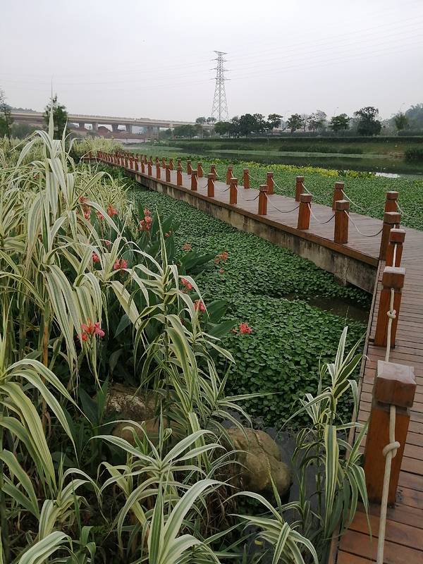 南宁那考河湿地公园的河道上有木栈道和凉亭,木栈道蜿蜒曲折,两旁是高高的水生美人蕉、花叶芦竹等植物,有些比人还高。走在木栈道上,清风一吹,草香、花香扑鼻。这条木栈道就是2017年大领导来参观走过的路,确实体现了“ 河畅水清岸绿景美 ”。