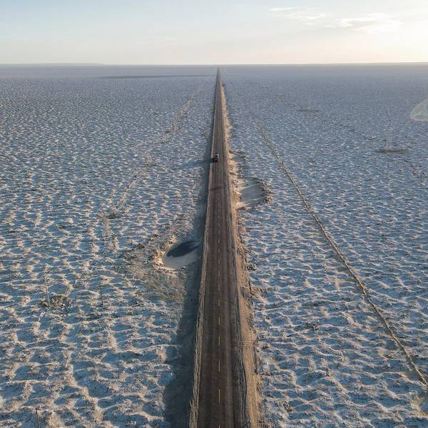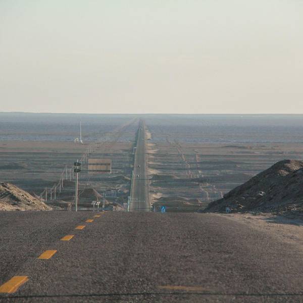 305是一条比较冷门的荒原公路,沿途经过盐滩、雅丹、戈壁等地貌,道路笔直看不到头,平时大车会多一点