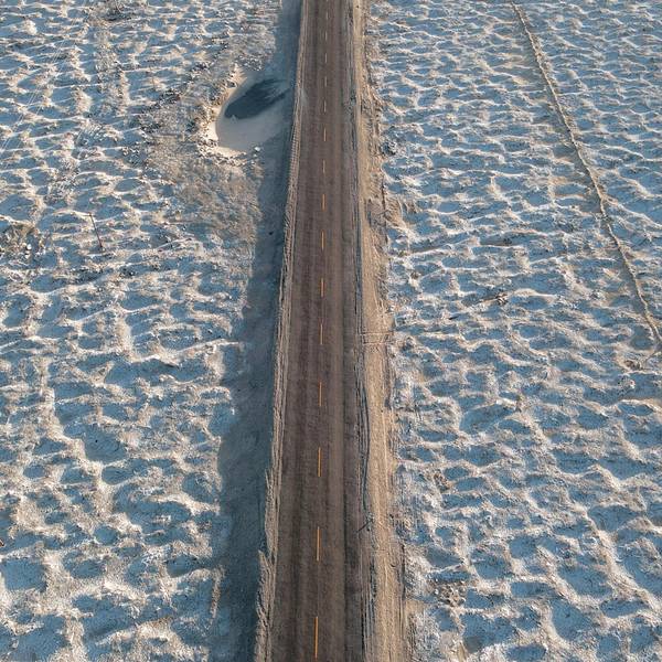 在305上火星营地分叉路到冷湖之间,有一大片的盐滩,高空看上去特别美、特别壮观,因为修车耽搁了,那天我们是靠近太阳落山才到的,夕阳把盐滩都照的有点黄了,风很大,飞机在天上晃晃悠悠的,能拍正都不错了(捂脸),不过最终效果还可以。盐滩很白,就像一片看不到头的雪地,这一段是我觉得305上最美的路段了。