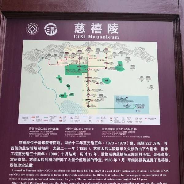不远处就是慈禧的定东陵慈禧的陵寝和乾隆的相差无几地宫也是很华丽大气,没看出来和乾隆的裕陵有什么差别慈禧定东陵地宫外面的建筑,同样很大气在慈禧的定东陵出来后这片区域就都游走到了,由于乾隆和慈禧的陵寝被盗掘过,所以抢救发掘后都是开放的,其它陵寝保持较好就都没有发掘开放