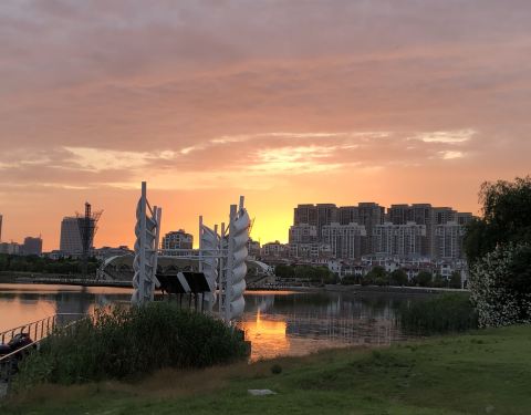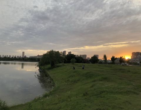 江苏省南通市海安市七星湖生态园是一个开放性的公园,图片是当地前两天去的时候拍的。当时正是黄昏时分,彩霞满天,湖水幽深,有人在那里钓鱼,也有人野餐,一片安静祥和的气氛。
