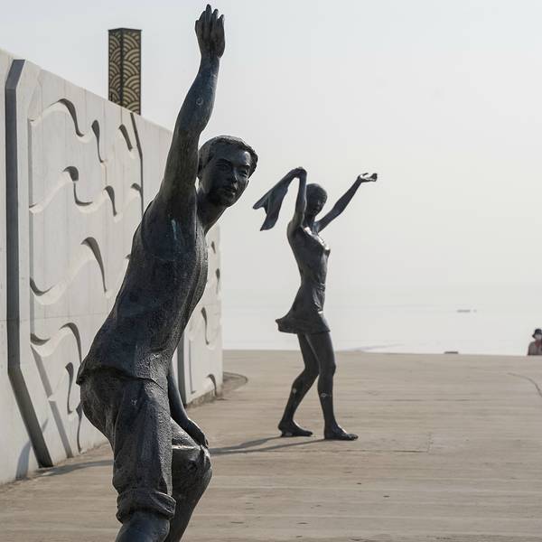 ...塑群,雕塑群的人物非常的形象生动,描绘的是来这里观海的游客,有的拿着相机,有的开心的向海边奔去