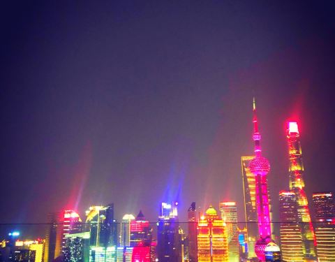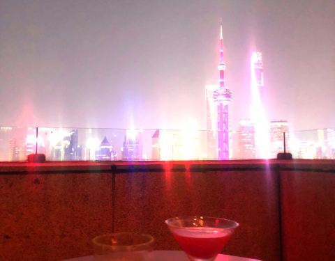当天是阴天,看着浦江两岸夜雾缭绕的,很魔都哦!顶楼有两位老板还特地帮我们打灯拍照,感谢啦! 晚餐在一楼新大陆吃的,撑得来……酒就喝不下了,看了这个景已经醉了嘻嘻!