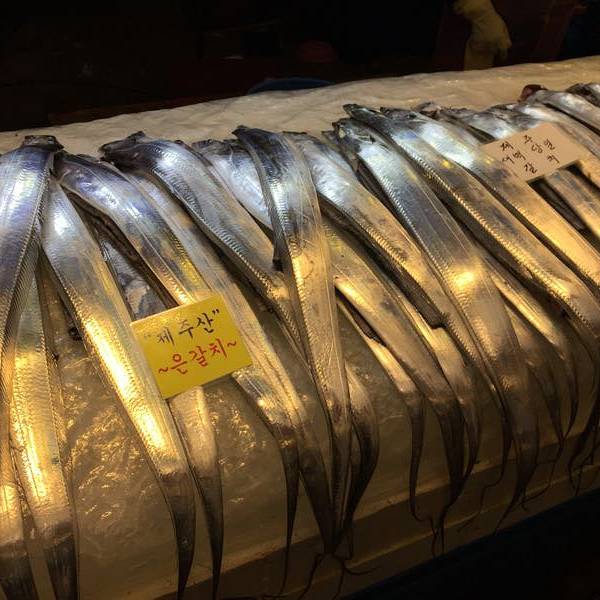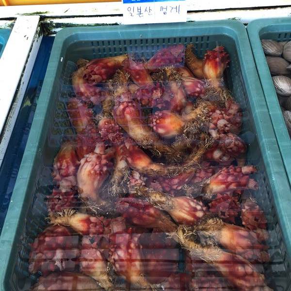 前往济州岛民俗自然史博物馆游览,正赶上饭点,无意中从大众点评网搜到附近的东门市场,我们在市场转了一大圈。这里有海鲜、海鲜制品、水果、蔬菜、糕点、服装、日用品,类似于中国的农贸市场和小商品市场。看了一下价格,似乎也不太便宜,但东西很新鲜,尤其是海鲜,螃蟹、章鱼、各种鱼,好多是活的,带鱼银光闪闪,在北京是很少看到。济州岛盛产柑橘,有许多柑橘的摊位,我们一直在寻找著名的汉拿桔,问了一下现在还没上市,商家就推荐其它橘子,品尝了一下,不太甜,故没有买。我们找到了一家市场内做海鲜的饭店,买了生鱼片、活章鱼、海肠、海鞘、腌螃蟹等,进店品味。在这里吃海鲜比别的地方便宜好多。