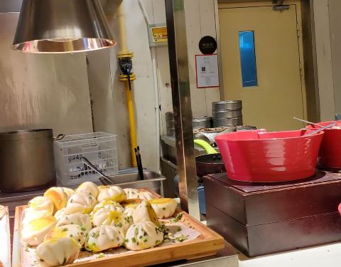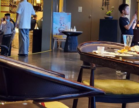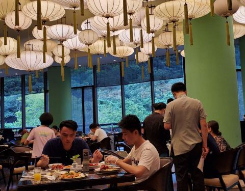 波罗蜜多自助餐厅,空间很大,装修和酒店风格一样具有禅意。但因为拈花湾游客中有不少购买了套票的,也到酒店吃自助餐,餐厅也是人满为患了。自助餐的品种还过得去,最近热门的菜是小龙虾,还有牛肉做得非常好,很入味。