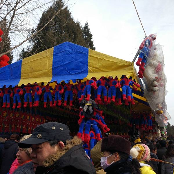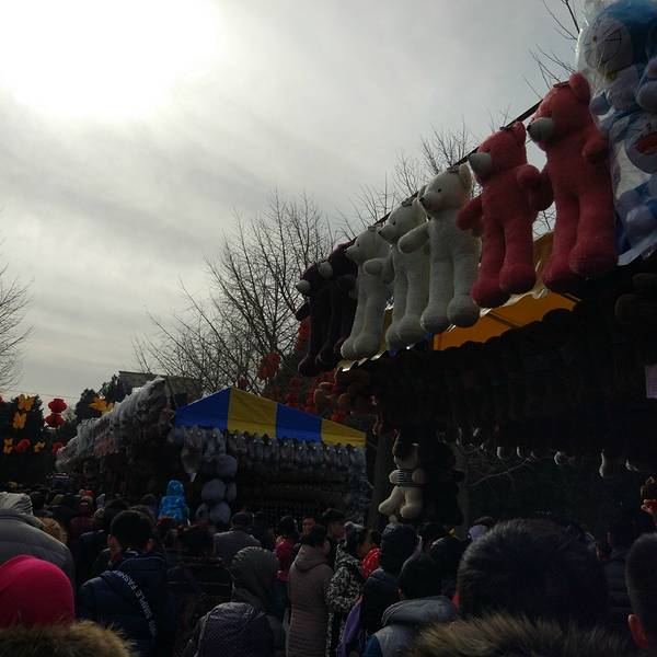 虽然有点雾霾,但是不影响大家来庙会过年的心情,初一的庙会最热闹。有很多各地的美食,杂耍和地方特产。不过因为人实在太多了,很多美食前面都是人头攒动,根本没有信心在寒风中排队半小时了。另外还有很多游戏的地方,价格是30元5个游戏币,游戏赢了可以获得不一样大小的娃娃,不过感觉和娃娃机一样,赢的难度实在很大。喜欢热闹的人一定要去逛一下,不虚此行。今年是鸡年,所以各个大门都被鸡的吉祥物占据了,想要和吉祥物合影还不是一件容易的事,要抢拍,因为人太多!