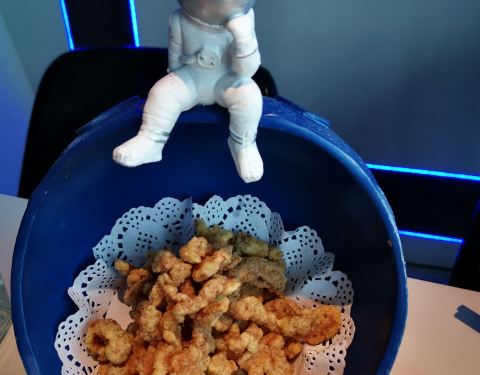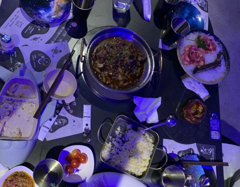 店内装修风格主打太空主题,有宇航员、太空舱元素,适合拍合影,好有feel。不太辣的香辣锅(mini活蛙仔2斤),很辣很过瘾,一份够两人吃了。秘制酥肉装在有太空特色的容器里,好可爱,炸的酥松美味。鸭血切片摆盘好,很嫩很新鲜。红海对虾摆盘也好好看,对虾新鲜,口感好鲜美。