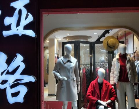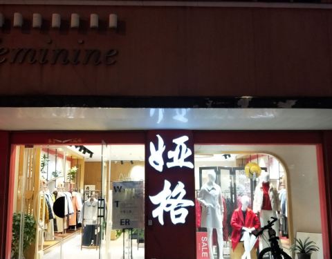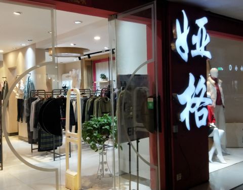 这家服装店店名就娅格两个字,十分精简,里面装修也是偏简约风,晚上灯光开着比较亮堂。店门口有三个穿着店里服装的人像模特算是特色了,店里格调走的应该是女性商务路线。