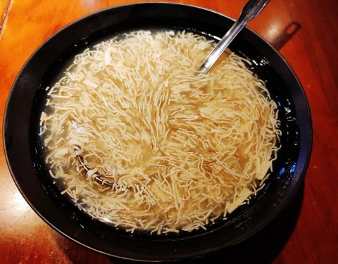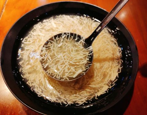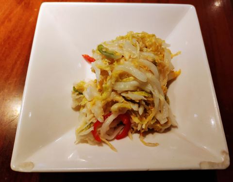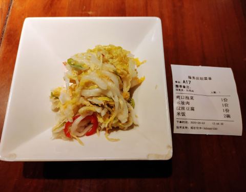 只需三元的菜品,本以为是精致的一盅,谁成想是满当当的一大盆,两道豆腐料理稍微有些味觉疲劳了,味素和淀粉的豆腐汤,豆腐丝儿也切的有点着急了,纹丝两字力道稍显不足,不是一道推荐菜。纹丝豆腐