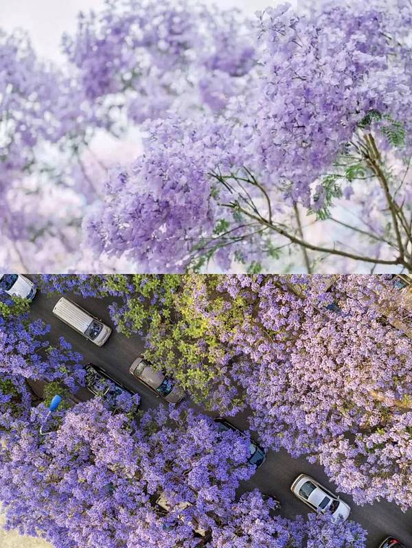 如果你觉得金色的花海不够独特,不妨来看看这片蓝紫色的海洋。每年的初夏,玉溪的蓝花楹进盛花期,城市里的大街小巷就会变成漂亮的花海之路。