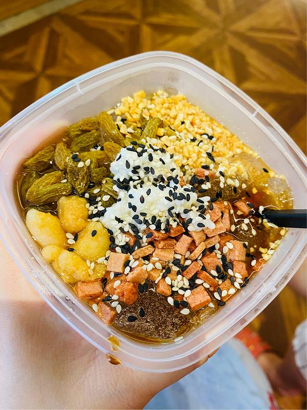 等位的时候秒杀了一份1元钱的冰粉,选的传统的红糖糍粑口味,怎么说呢,山楂、葡萄干、芝麻都有,份量还是足够的,味道很一般。恰恰前几天吃了胡悠记,不得不说差距还是蛮大的。